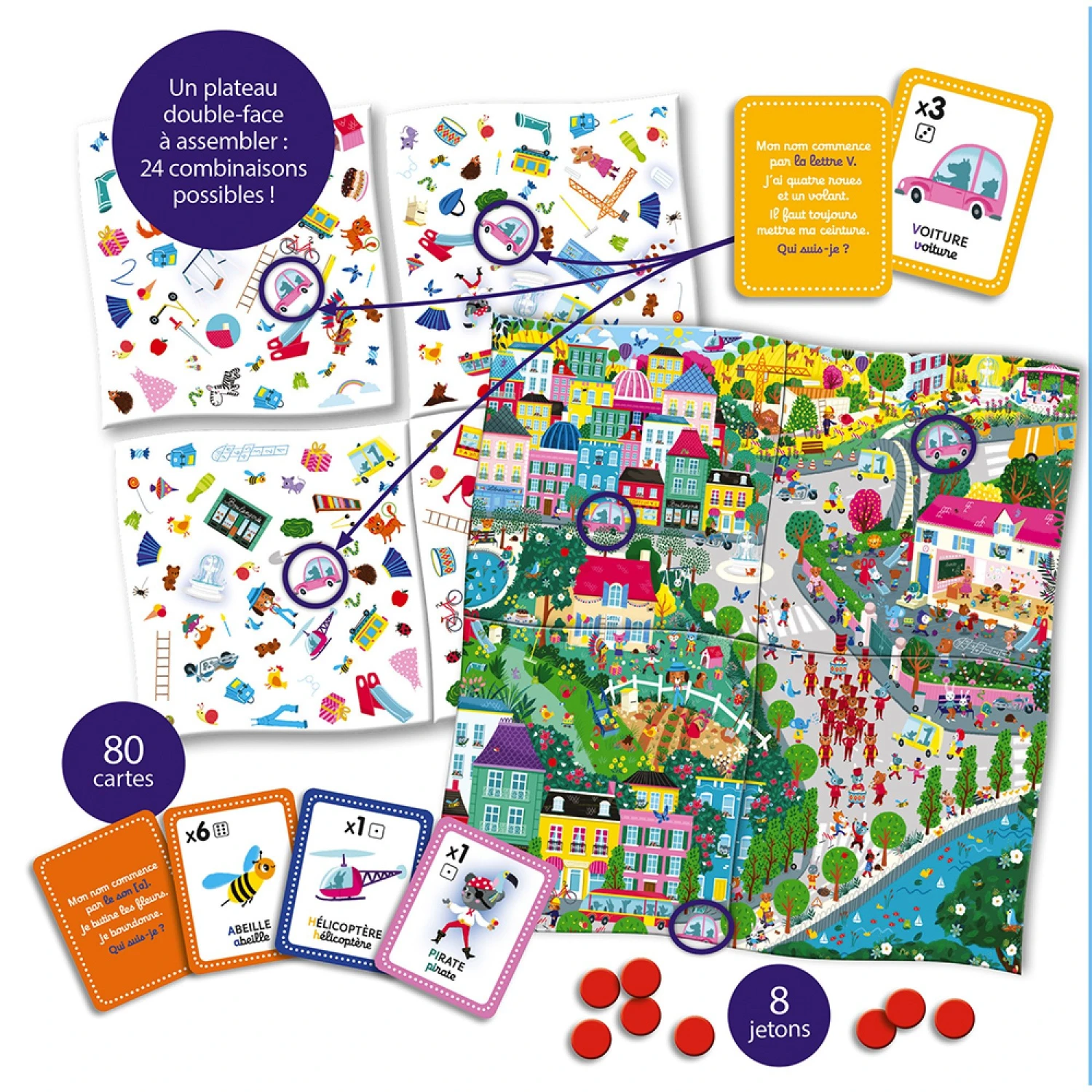Astucieux, le plateau de jeu éducatif Janod est double-face et modulable ! Il se compose de 4 parties amovibles, ce qui permet d’avoir 24 combinaisons possibles ! Voici un jeu parfait pour les enfants en plein acquisition de l’alphabet ! On apprend en s’amusant avec ce Cherche et Trouve sur le thème des lettres ! Comment jouer ? On pioche une carte question qui nous permettra d’identifier un élément à retrouver sur le plateau.