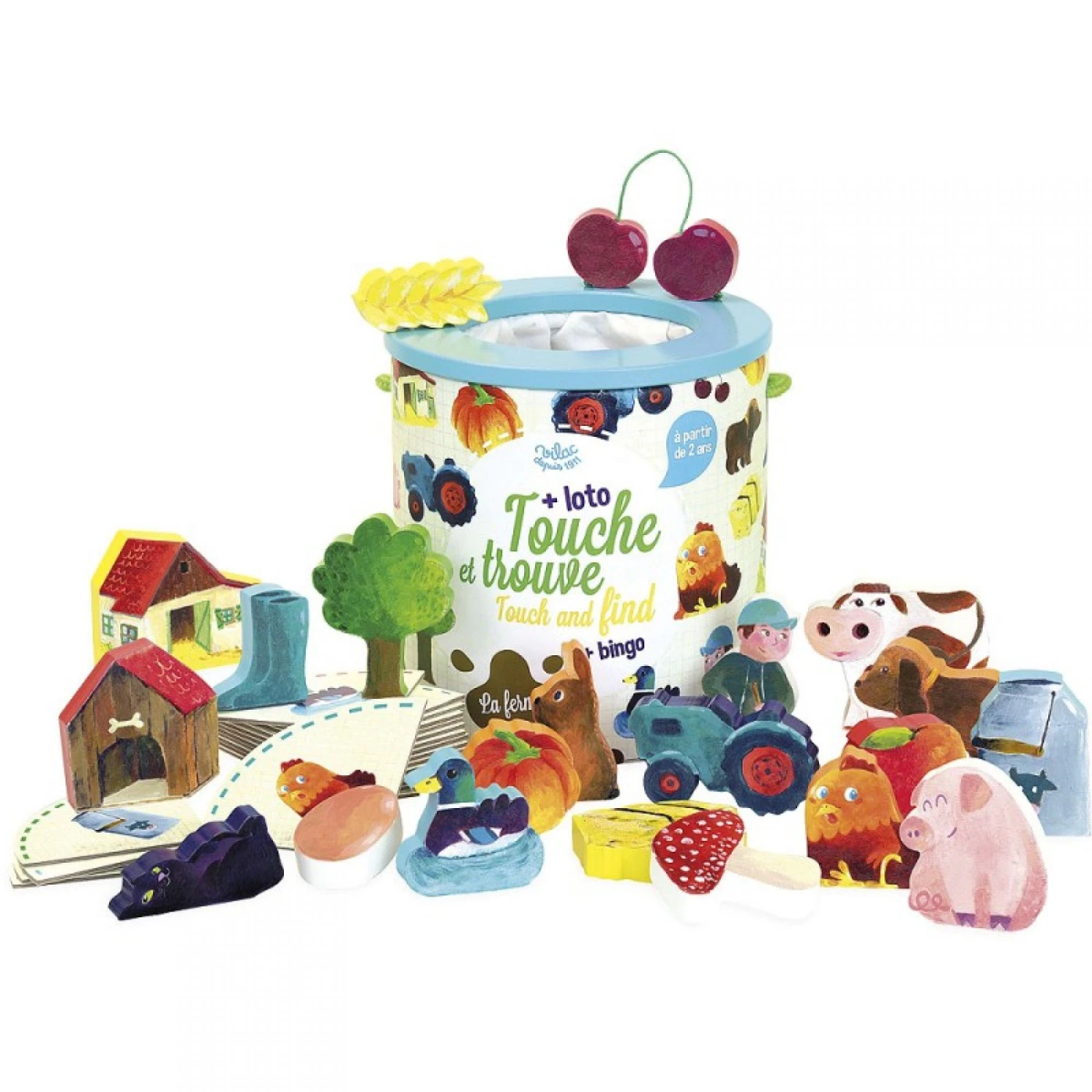 Mettrez votre main dans le sac pour retrouver des pièces sans les regarder. Ce jeu de société enfant 2 en 1 se compose d’un baril de rangement, de 21 pièces en bois dont une pièce piège, de 20 cartes illustrées autour du thème de la ferme. Avec ces cartes illustrées, le touche et trouve se transforme également en jeu de loto.